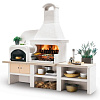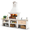 Выполнена из совместимых модулей. Столешница из полированного камня Marmotech. Основания всех модулей имеют заднюю стенку. Стальная решетка для дров и решетка из нержавеющей стали 76х40 см, с бакелитовыми ручками. Общие размеры: 450х85х218 cм.