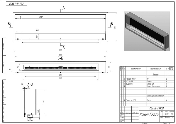 - Базовые размеры камина: 1600x200x450 мм