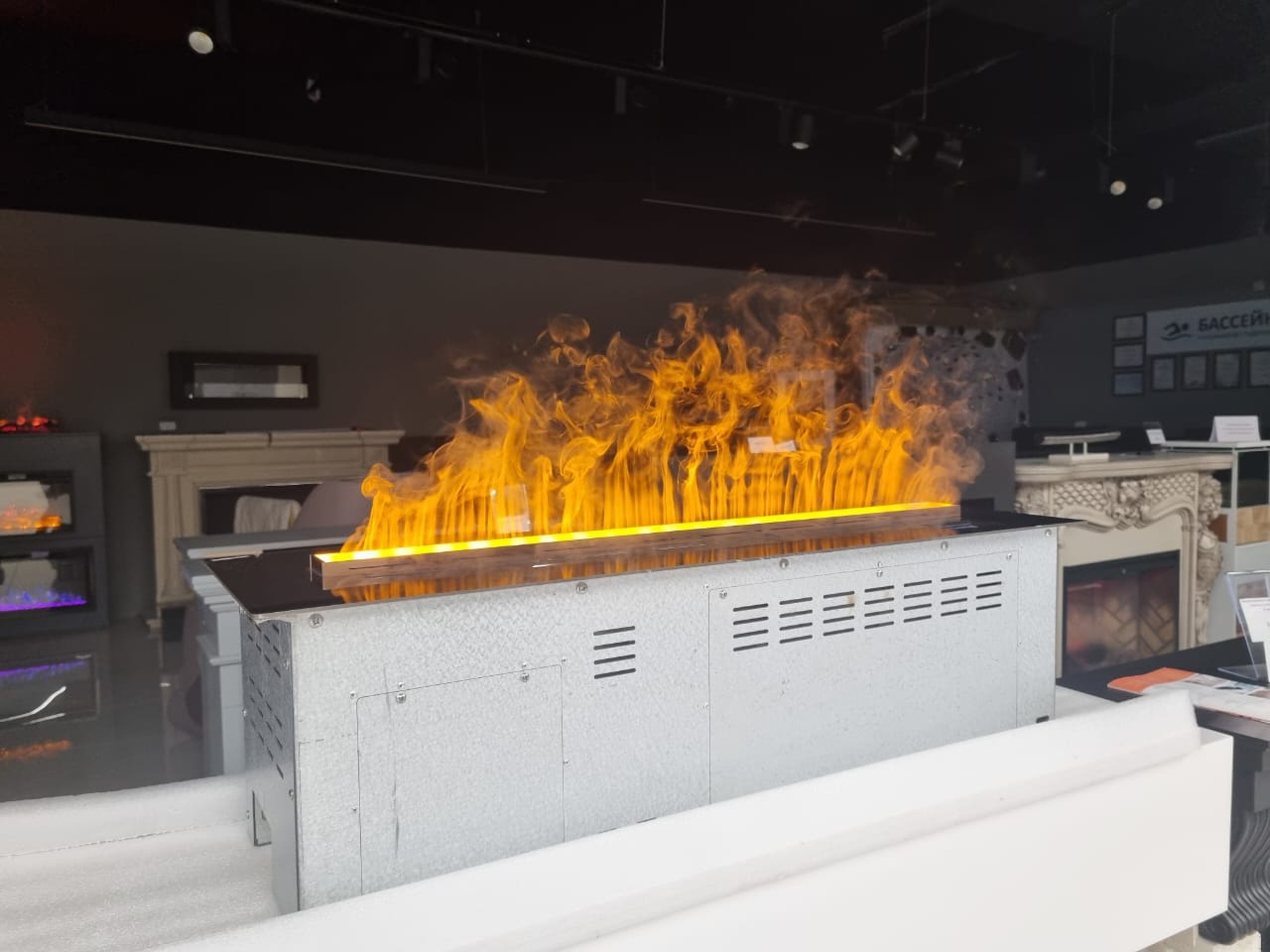 В первую очередь стоит отметить абсолютную безопасность этой модели. В качестве топлива выступает чистая вода, что обеспечивает абсолютную экологичность изделия. Формирование пламени происходит за счет работы ультразвуковых испарителей. Они формируют паровую завесу, которая распределяется по всей линии огня, а затем подсвечивается LED-лампами. Пар попадает непосредственно в помещение, способствуя дополнительному увлажнению воздуха в нем. Поэтому в каминной создаются комфортные для отдыха условия микроклимата.