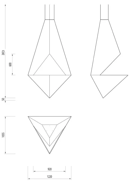 • В основе дизайна этого подвесного биокамина лежит простая геометрическая фигура – треугольник. Великолепие треугольных плоскостей придает камину энергию движения. Пламя, через призму треугольного взгляда, заставляет созерцать его с самой бескомпромиссной точки зрения.
