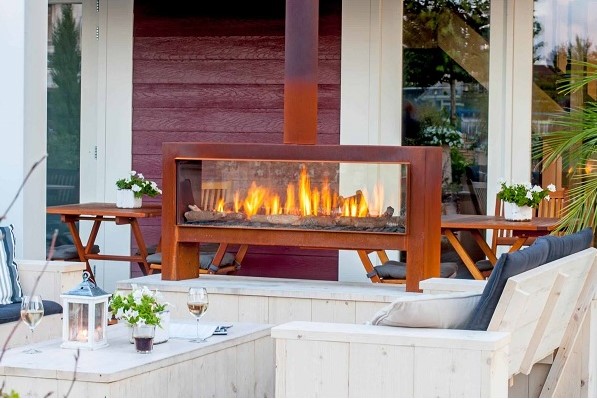 Газовый камин Faber The Mood является в некотором смысле универсальным. Ведь его можно использовать как в качестве отдельного элемента, так и в связке с облицовкой. Предусмотрена его эксплуатация на улице. С его помощью можно оформить террасы, патио и любые другие открытые площадки. Он отлично вписывается в существующий экстерьер, что особенно актуально, если вы оформляете уже существующую площадку. Широкое стекло открывает прекрасный вид на горящее внутри пламя. А общую картину дополняет оригинальное наполнение топки.