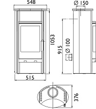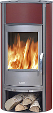 Дверца открывается вбок. Корпус из утолщенной стали, чугунный очаг, витрокерамическое стекло, резистентное к температуре до 800°, бак для воды на 90 литров.
