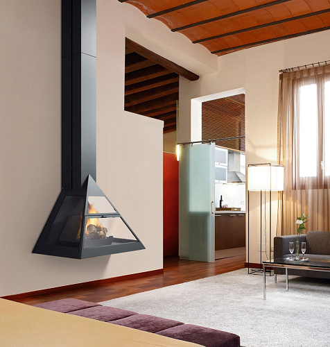 Фронтальный камин с верхним подключением, со стеклом.. Цвет - черный. Система двойного дожига. Широкая панорама огня, дающая возможность выбора любого расположения со стеновыми креплениями или на специальном пьедестале.