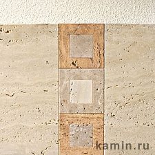 Портал из светлого травертина с декоративной мозайкой из травертина разных тональностей. Задняя панель из светлого бучардированного мрамора.
