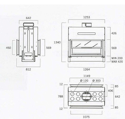 Двусторонняя стальная топка с плоскими стеклами. 2 дверцы с подъемом вверх.
