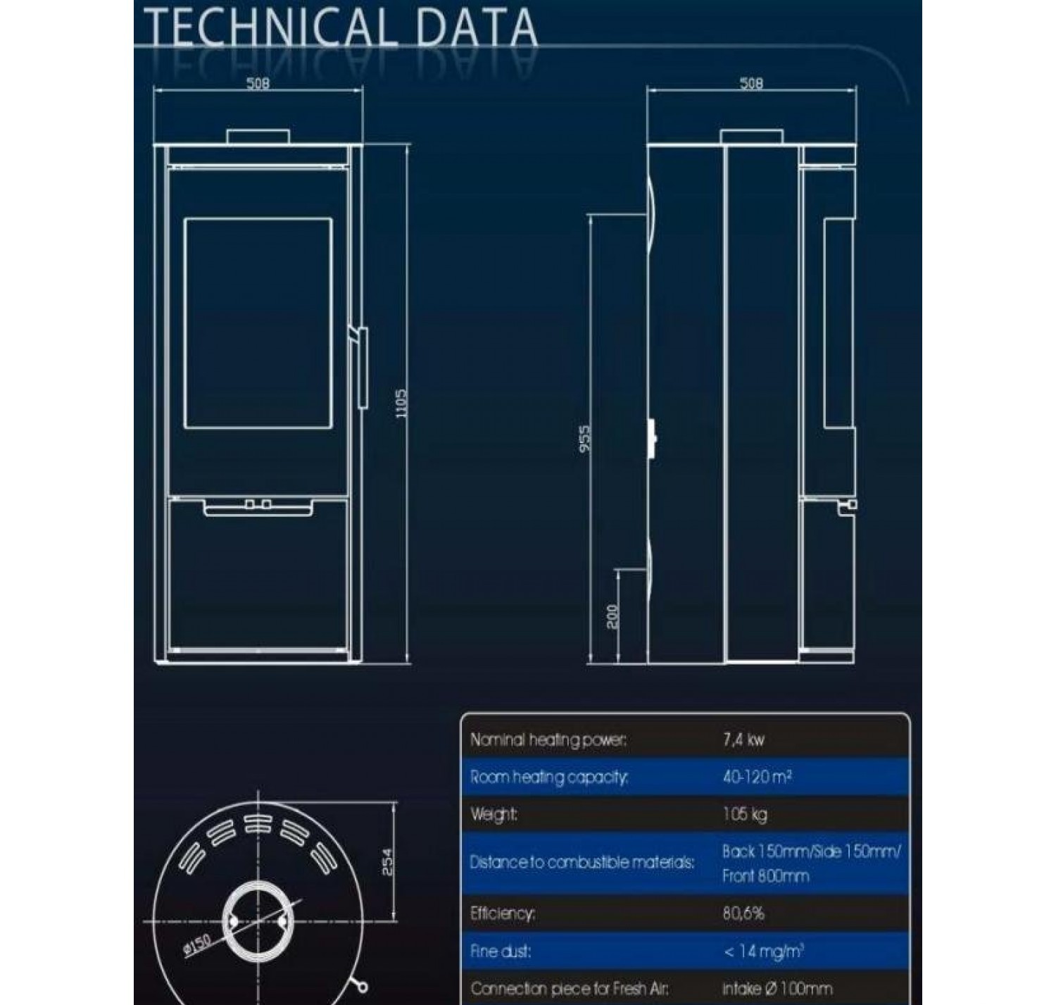 - Диаметр дымохода, (мм) 150 мм.