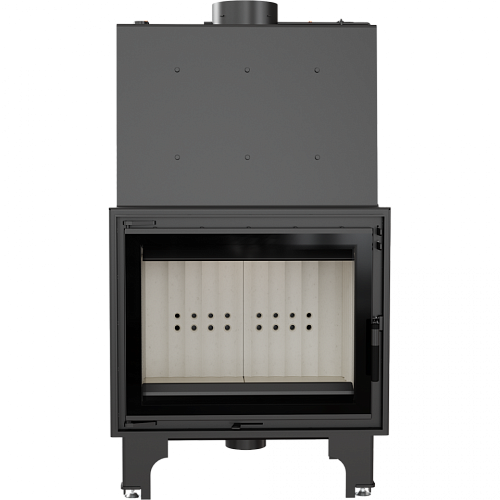 - Система аэрации камеры сгорания, реализована исключительно извне через доставку первичного и вторичного воздуха в камеру сгорания. Стандартно топка имеет подвод воздуха диаметром ø 125 мм, который дает возможность подать свежий воздух в камеру сгорания снаружи здания. Разделение воздуха проходит в пространстве ниже нижней плиты камеры сгорания. Воздух поступает каналом, который находится на высоте нижней плиты к забору, оборудованному вдоль всей длины системой отверстий. Это приводит к улучшениям условий сгорания шихты. Сгорание происходит равномерно по всей ширине камеры сгорания. Регулировка интенсивности сгорания в топке происходит с помощью механизма, который находится ниже дверец топки.
