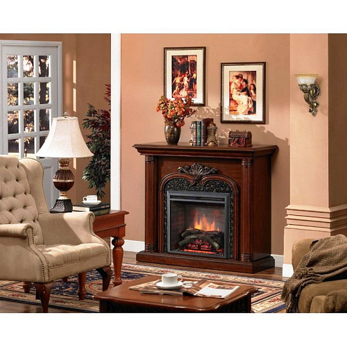- Портал изготовлен из МДФ и облицован натуральным шпоном дуба. Благодаря своей гармоничности и воздушному белому цвету электрокамин эффектно смотрится, а тонкие круглые колонны с вертикальными каннелюрами, необычная форма арки и сложный резной орнамент в центре над очагом, придают ему художественность и благородство.